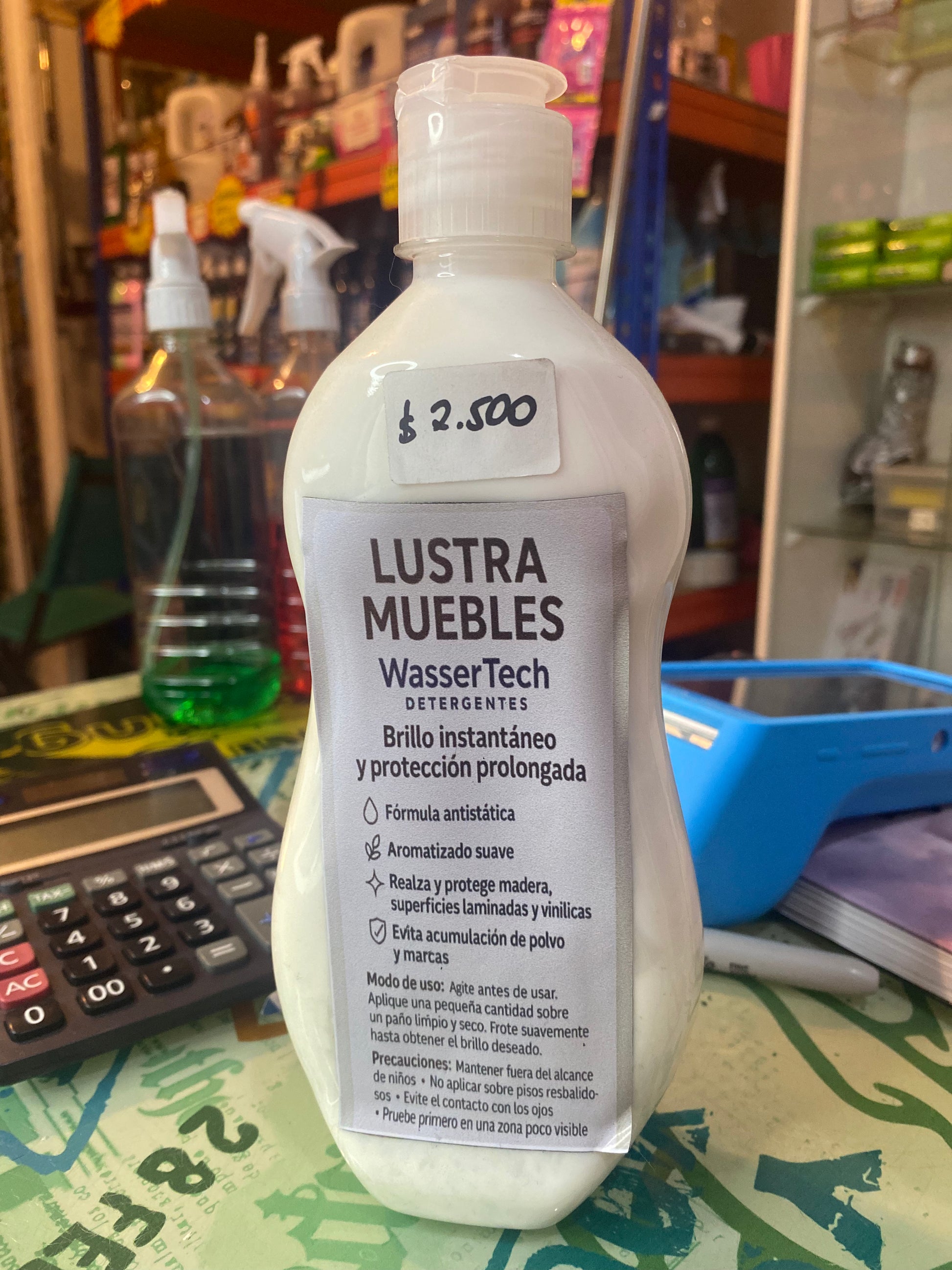 Lustra Muebles Wassertech, brillo y protección para tus muebles, limpia, renueva superficies de madera, cuero, plásticos y vinílicos. Repele el polvo y cuida con cada aplicación.