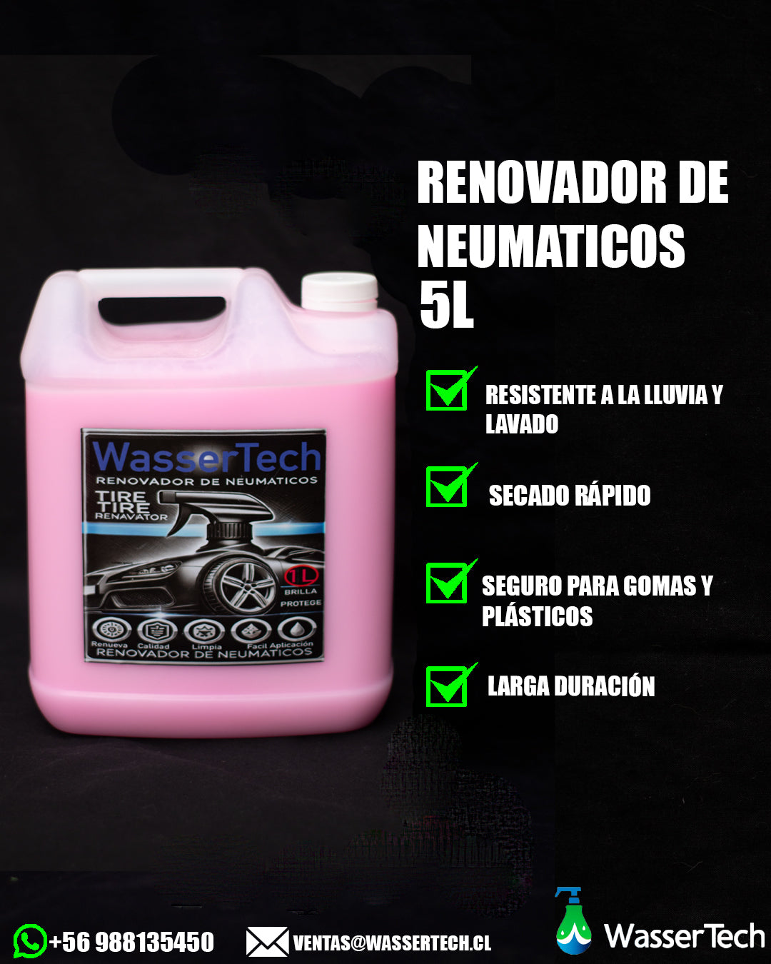 Dale nueva vida a tus neumáticos con nuestro Renovador de Neumáticos WasserTech, formulado para devolverles el color negro intenso y protegerlos del desgaste, el polvo y los rayos UV. Su fórmula avanzada crea una capa brillante y resistente, ideal para un acabado profesional, ya sea en uso doméstico o automotriz.